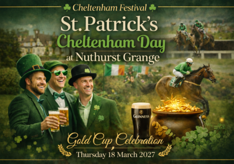 Experience the Thrill of St Patrick’s Cheltenham Day at Nuthurst Grange! Join us on Friday, Thursday 18th March 2027, for an unforgettable day at our countryside retreat as we celebrate the Cheltenham…
